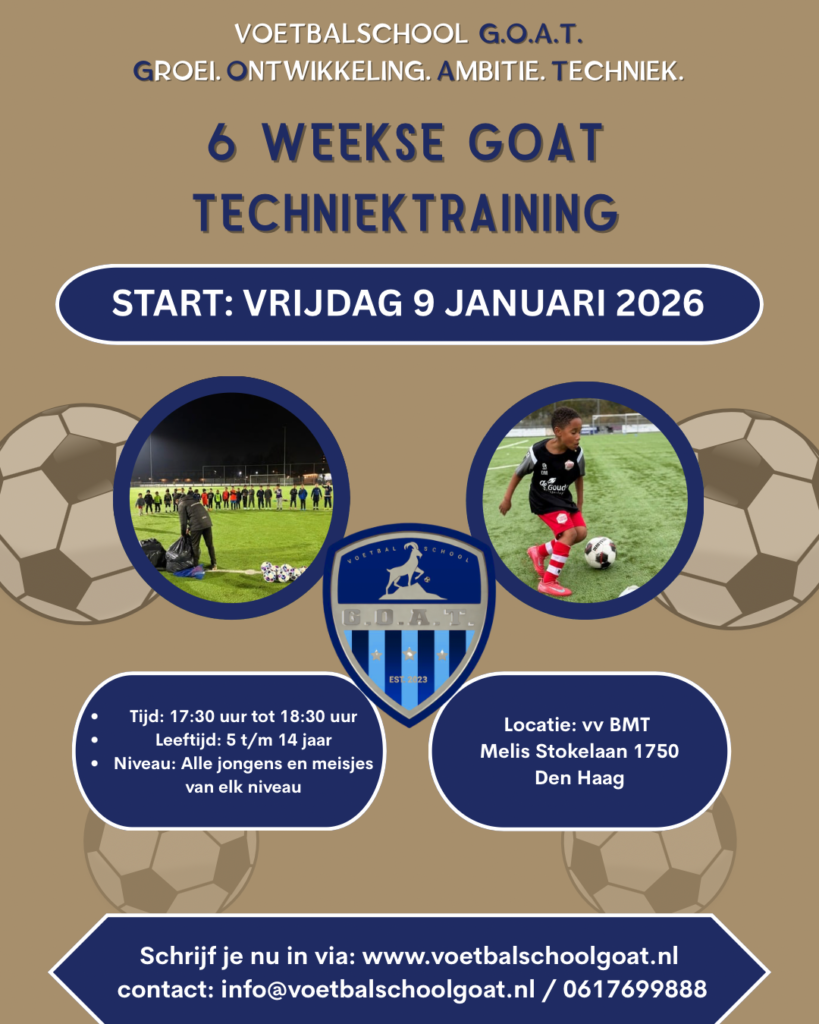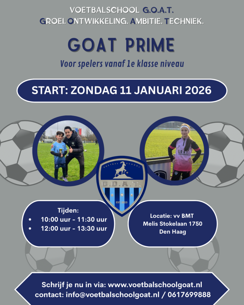 Bij voetbalschool G.O.A.T. helpen we de kinderen van 5 t/m 15 jaar om hun voetbalvaardigheden te ontwikkelen en klaar te stomen tot een echte GOAT!
